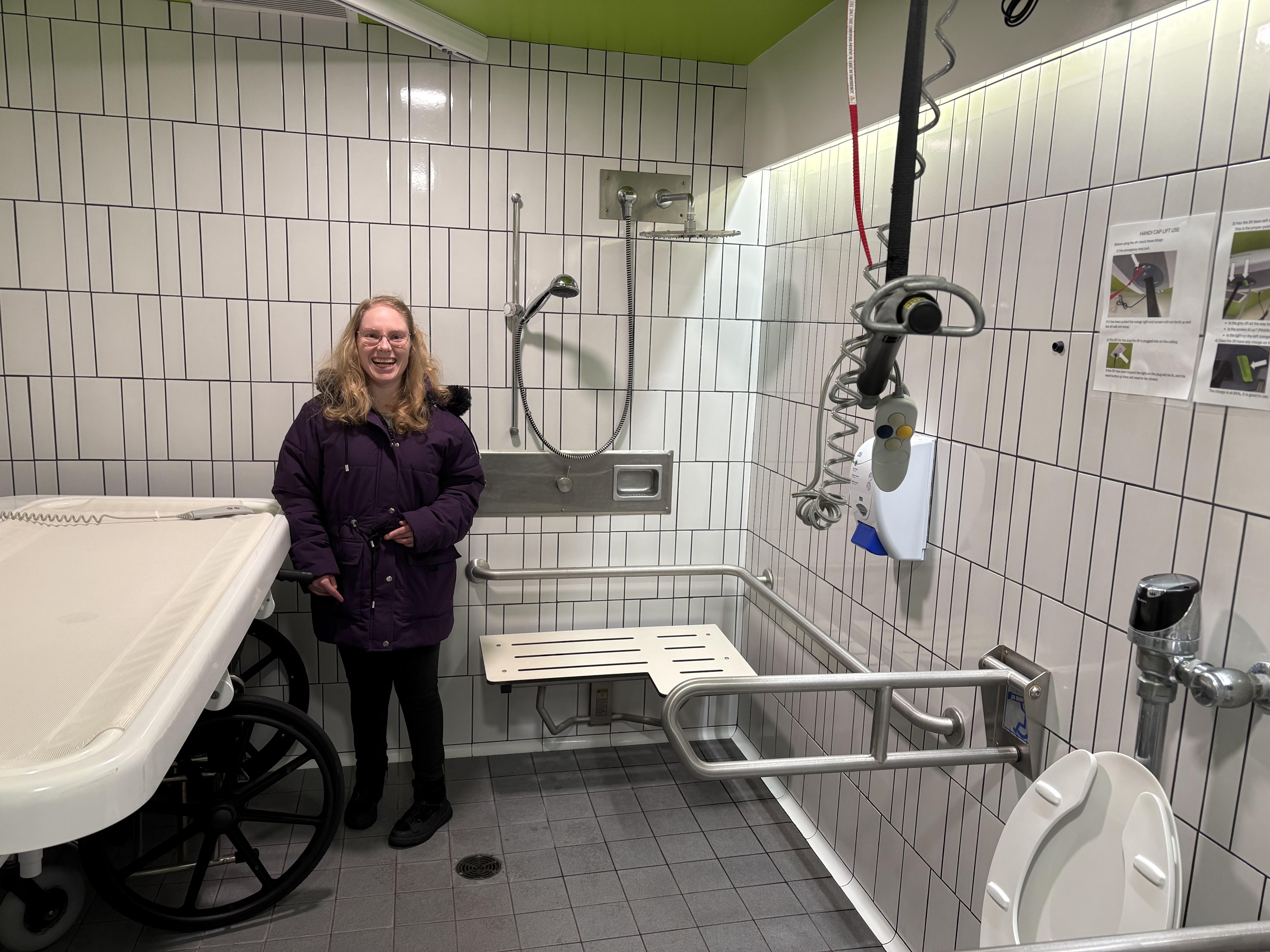 Accessibility consultant Melissa Lyon checking out the accessible bathroom at the Terrace & District Aquatic Centre.